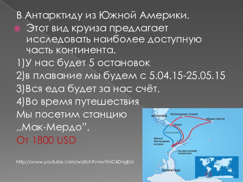 В Антарктиду из Южной Америки.Этот вид круиза предлагает исследовать наиболее доступную часть континента.1)У нас будет 5 остановок2)в