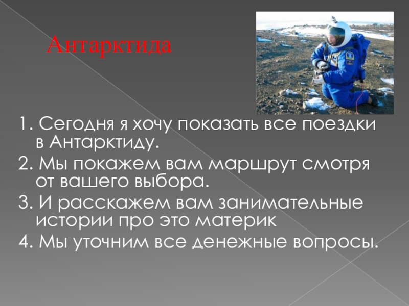 Антарктида1. Сегодня я хочу показать все поездки в Антарктиду.  2. Мы покажем вам маршрут смотря от