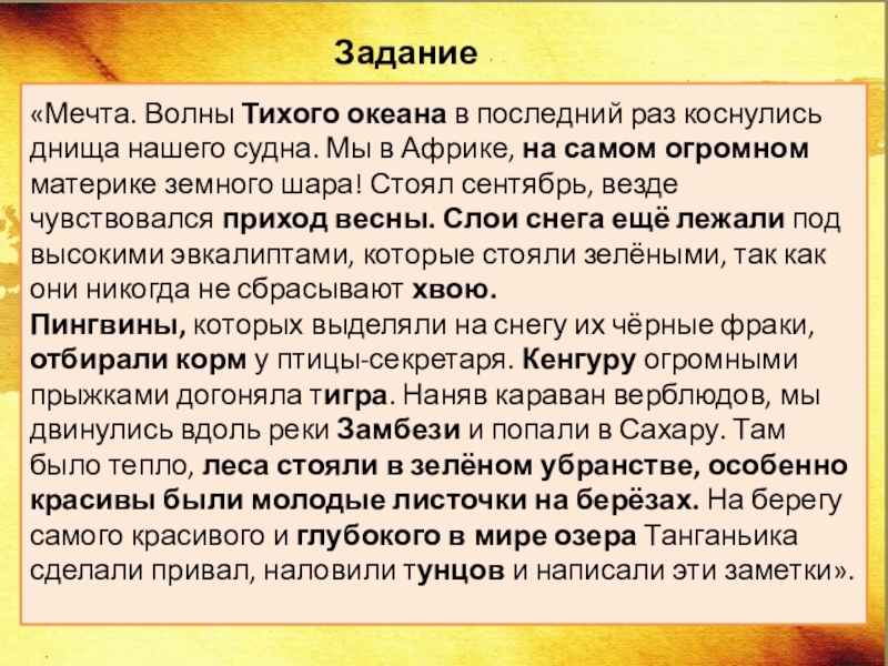 Задание 5 «Мечта. Волны Тихого океана в последний раз коснулись днища нашего судна. Мы в Африке, на