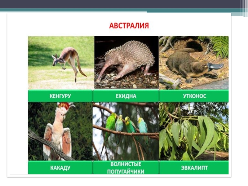 Австралия — уникальный материк, имеющий самое большое количество животных и растений – эндемиков. Коренное население — австралийские аборигены, или бушмены.