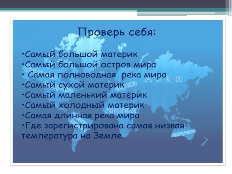 В Африке находятся самая длинная река в мире — Нил и самая обширная пустыня — Сахара.