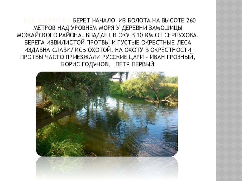 над уровнем моря у деревни Замошицы Можайского района. Впадает в Оку в 10 км от Серпухова. Берега извилистой Протвы и густые окрестные леса издавна славились охотой. На охоту в окрестности Протвы часто приезжали русские цари - Иван Грозный, Борис Годунов, Петр Первый