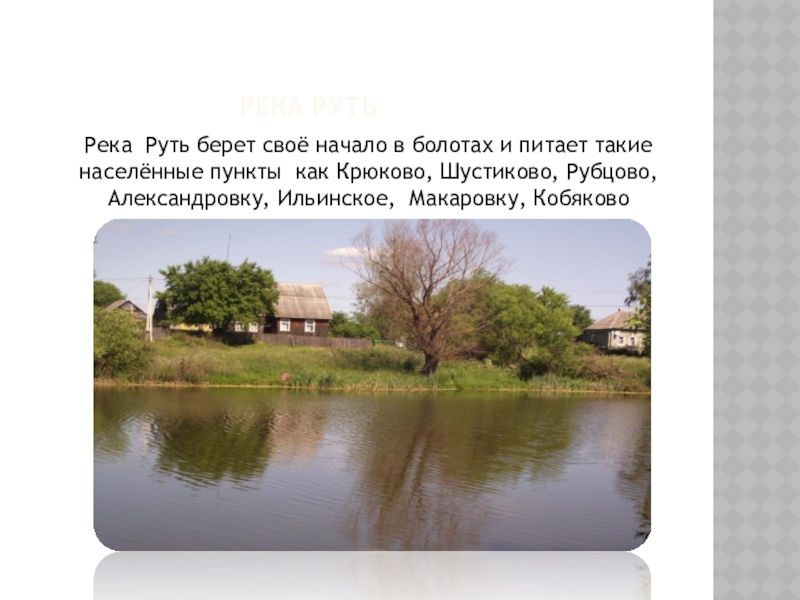 РЕКА РУТЬРека Руть берет своё начало в болотах и питает такие населённые пункты как Крюково, Шустиково, Рубцово,