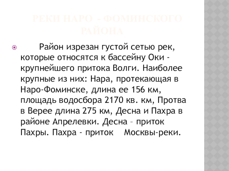 Реки Наро - Фоминского района Район изрезан густой сетью рек, которые относятся к бассейну Оки - крупнейшего притока Волги. Наиболее крупные из них: Нара, протекающая в Наро-Фоминске, длина ее 156 км,