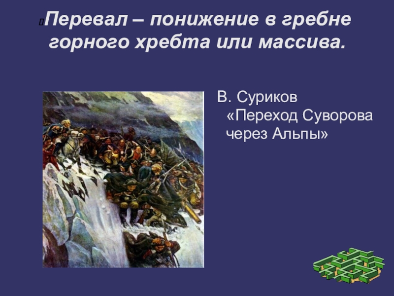 Перевал – понижение в гребне горного хребта или массива. В. Суриков «Переход Суворова через Альпы»
