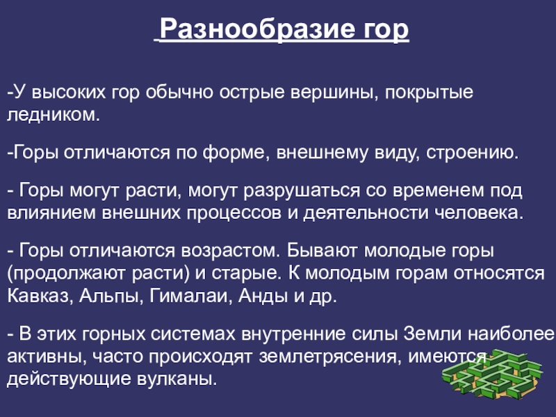 -У высоких гор обычно острые вершины, покрытые ледником. -Горы отличаются по форме, внешнему виду, строению.- Горы могут