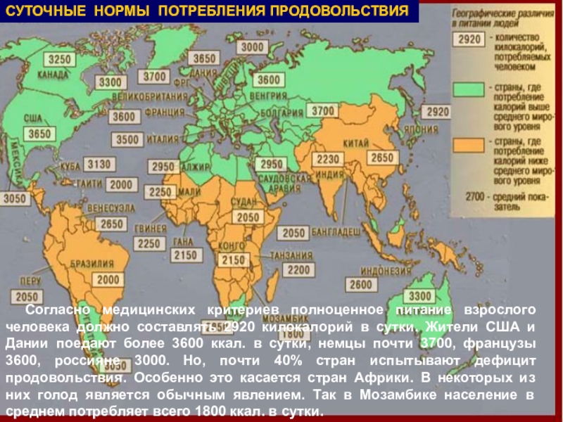должно составлять 2920 килокалорий в сутки. Жители США и Дании поедают более 3600 ккал. в сутки, немцы почти 3700, французы 3600, россияне 3000. Но, почти 40% стран испытывают дефицит продовольствия. Особенно это касается стран Африки. В некоторых из них голод является обычным явлением. Так в Мозамбике население в среднем потребляет всего 1800 ккал. в сутки.