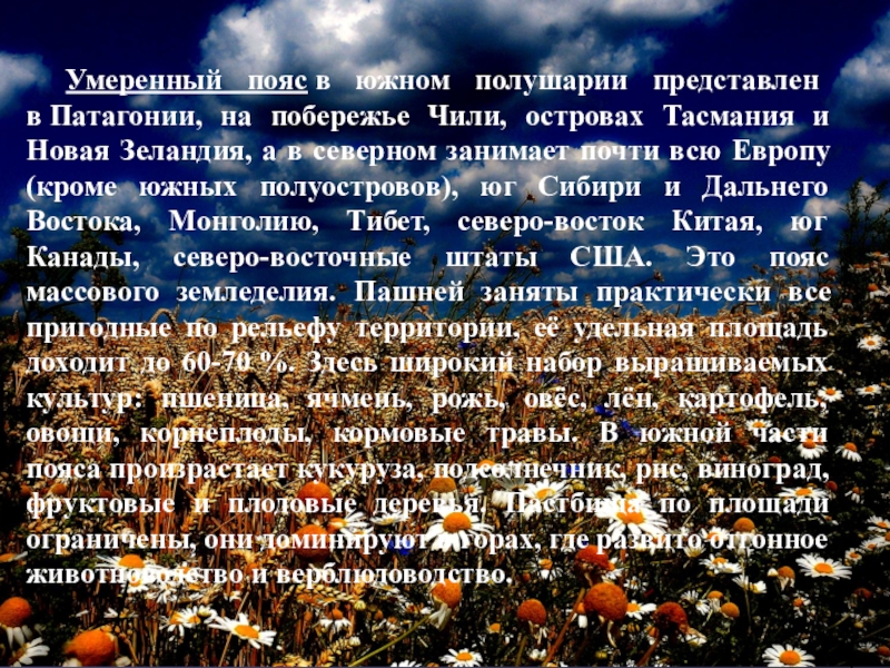Тасмания и Новая Зеландия, а в северном занимает почти всю Европу (кроме южных полуостровов), юг Сибири и Дальнего Востока, Монголию, Тибет, северо-восток Китая, юг Канады, северо-восточные штаты США. Это пояс массового земледелия. Пашней заняты практически все пригодные по рельефу территории, её удельная площадь доходит до 60-70 %. Здесь широкий набор выращиваемых культур: пшеница, ячмень, рожь, овёс, лён, картофель, овощи, корнеплоды, кормовые травы. В южной части пояса произрастает кукуруза, подсолнечник, рис, виноград, фруктовые и плодовые деревья. Пастбища по площади ограничены, они доминируют в горах, где развито отгонное животноводство и верблюдоводство.