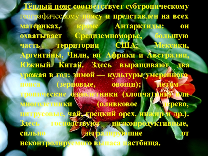 кроме Антарктиды: он охватывает Средиземноморье, большую часть территории США, Мексики, Аргентины, Чили, юг Африки и Австралии, Южный Китай. Здесь выращивают два урожая в год: зимой — культуры умеренного пояса (зерновые, овощи); летом — тропические однолетники (хлопчатник) или многолетники (оливковое дерево, цитрусовые, чай, грецкий орех, инжир и др.). Здесь господствуют низкопродуктивные, сильно деградирующие от неконтролируемого выпаса пастбища.