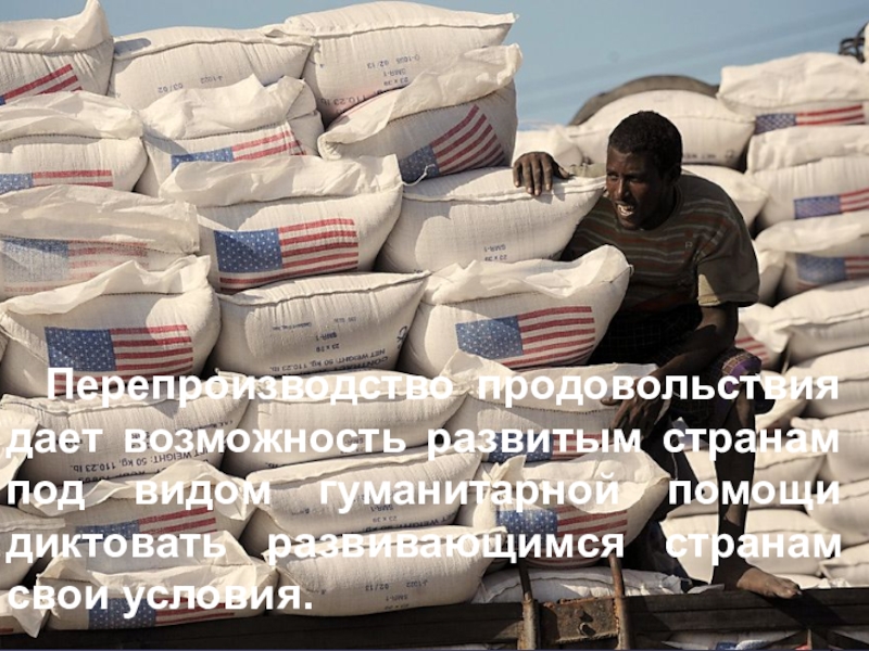 Слайд 8 Перепроизводство продовольствия дает возможность развитым странам под видом гуманитарной помощи