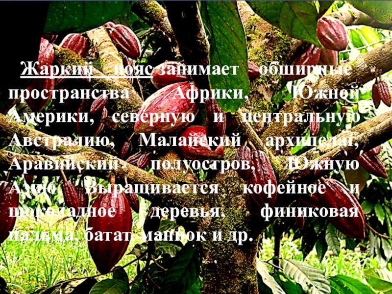 Слайд 16 Жаркий пояс занимает обширные пространства Африки, Южной Америки, северную и центральную