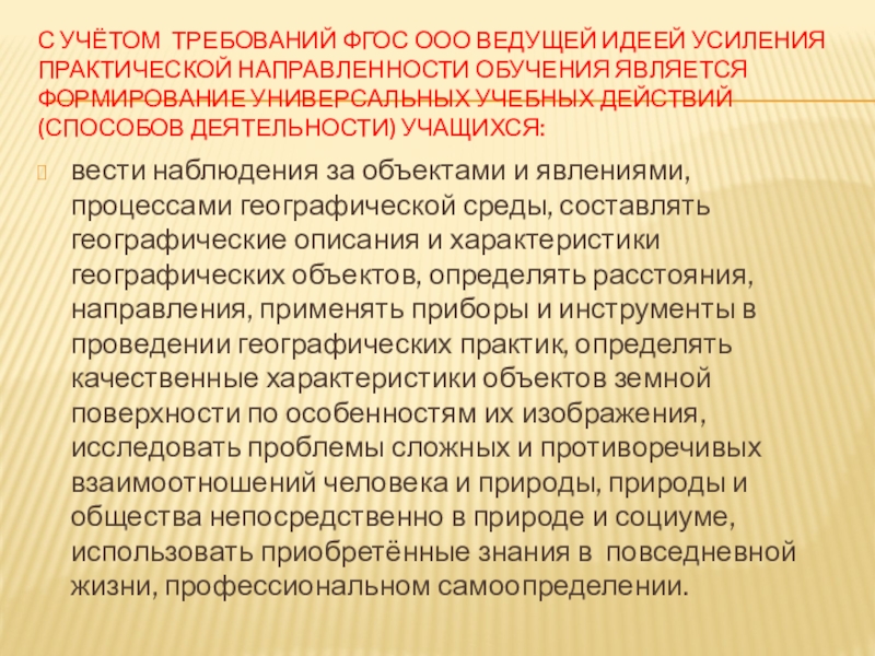 С учётом требований ФГОС ООО ведущей идеей усиления практической направленности обучения является формирование универсальных учебных действий (способов деятельности) учащихся: