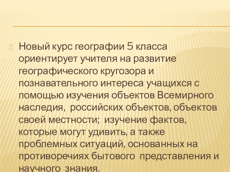 Таким образом, новый курс географии 5 класса в соответствии с главными идеями образовательного стандарта общего образования второго поколения сочетает в себе черты инновационности и традиционности. Нельзя тормозить процесс перехода преподавания школьной географии с 5 класса, откладывая на более поздние сроки, так как материалы ГИА, ЭГЭ как формы итоговой аттестации школьников включают содержание требований ФГОС ООО с 5 класса, ежегодно пересматриваются в соответствии с новым социальным заказом современной системе образования.