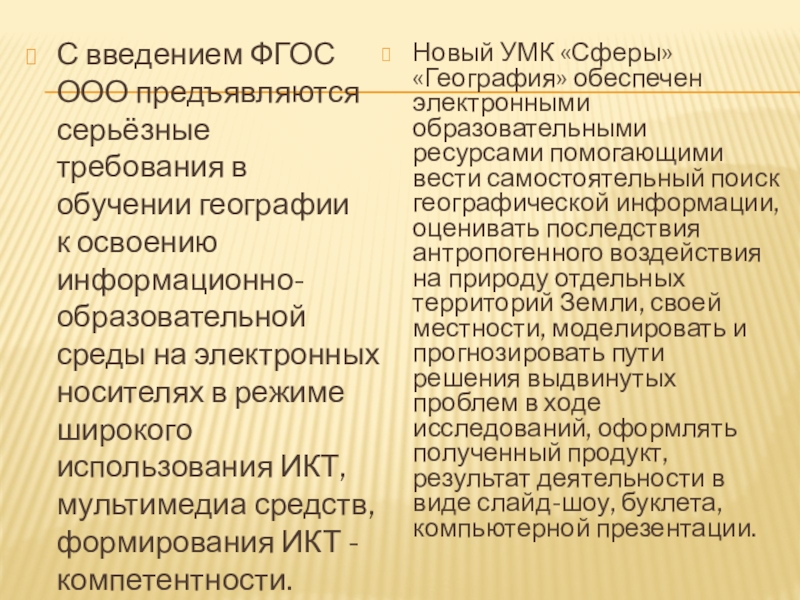 Новый УМК «Сферы» «География» обеспечен электронными образовательными ресурсами помогающими вести самостоятельный поиск географической информации, оценивать последствия антропогенного воздействия на природу отдельных территорий Земли, своей местности, моделировать и прогнозировать пути решения выдвинутых проблем в ходе исследований, оформлять полученный продукт, результат деятельности в виде слайд-шоу, буклета, компьютерной презентации.
