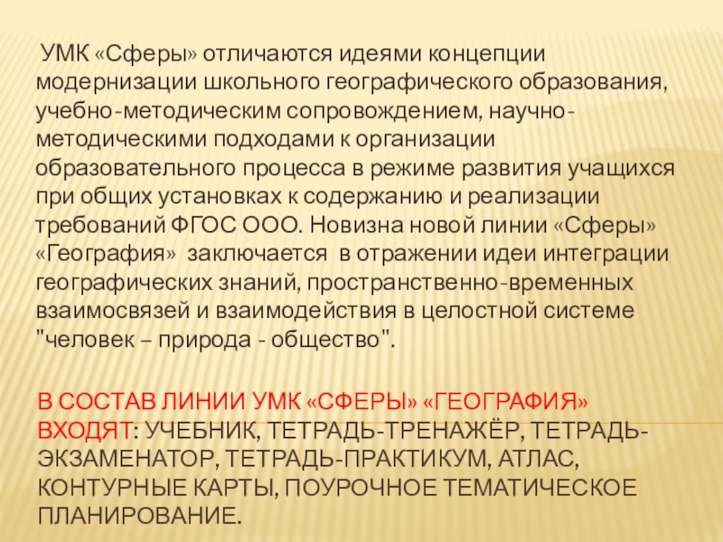 УМК «Сферы» отличаются идеями концепции модернизации школьного географического образования, учебно-методическим сопровождением, научно-методическими подходами к организации образовательного процесса в режиме развития учащихся при общих установках к содержанию и реализации требований ФГОС ООО. Новизна новой линии «Сферы» «География» заключается в отражении идеи интеграции географических знаний, пространственно-временных взаимосвязей и взаимодействия в целостной системе "человек – природа - общество".