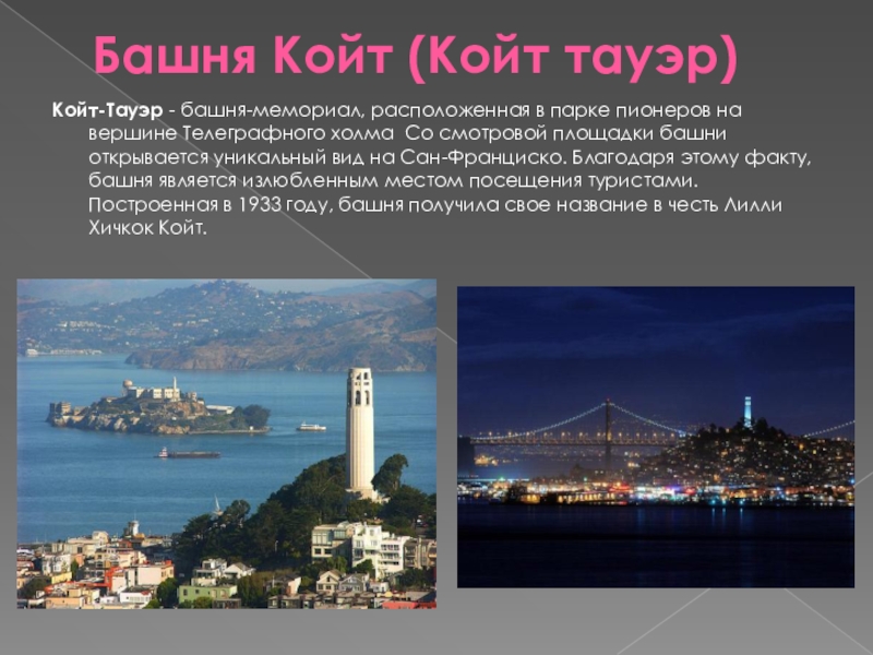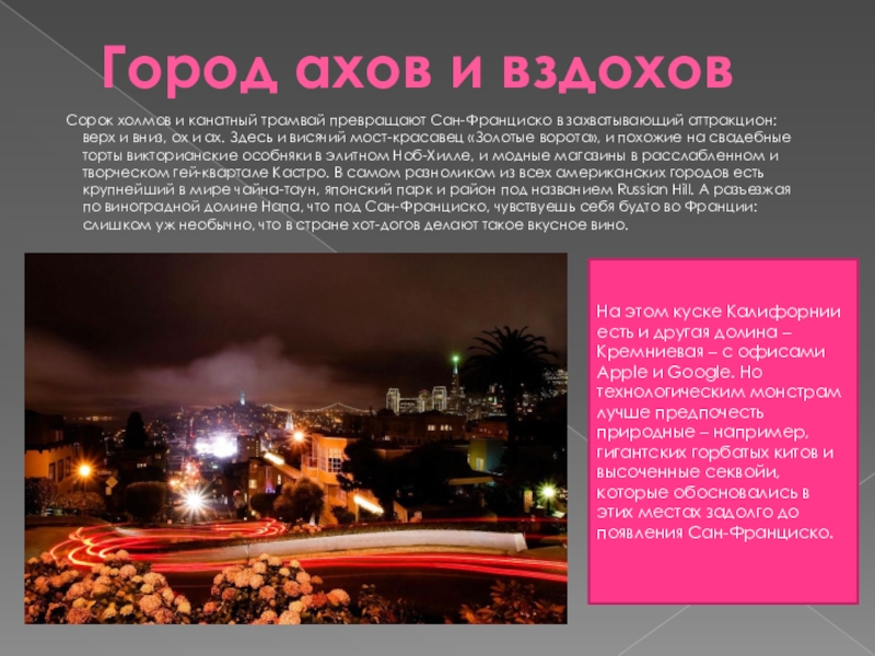 На этом куске Калифорнии есть и другая долина – Кремниевая – с офисами Apple и Google. Но технологическим монстрам лучше предпочесть природные – например, гигантских горбатых китов и высоченные секвойи, которые обосновались в этих местах задолго до появления Сан-Франциско.