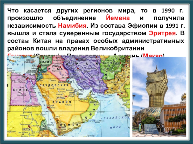 Йемена и получила независимость Намибия. Из состава Эфиопии в 1991 г. вышла и стала суверенным государством Эритрея. В состав Китая на правах особых административных районов вошли владения Великобритании