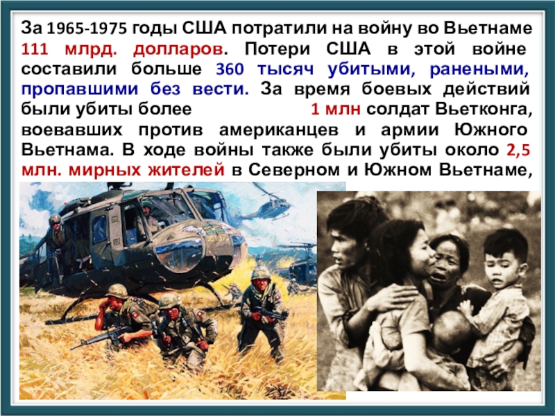 111 млрд. долларов. Потери США в этой войне составили больше 360 тысяч убитыми, ранеными, пропавшими без вести. За время боевых действий были убиты более 1 млн солдат Вьетконга, воевавших против американцев и армии Южного Вьетнама. В ходе войны также были убиты около 2,5 млн. мирных жителей в Северном и Южном Вьетнаме, соседних Лаосе и Кампучии.