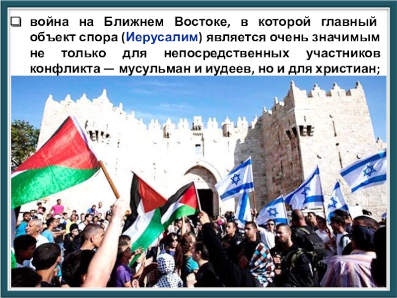 Слайд 40война на Ближнем Востоке, в которой главный объект спора (Иерусалим) является