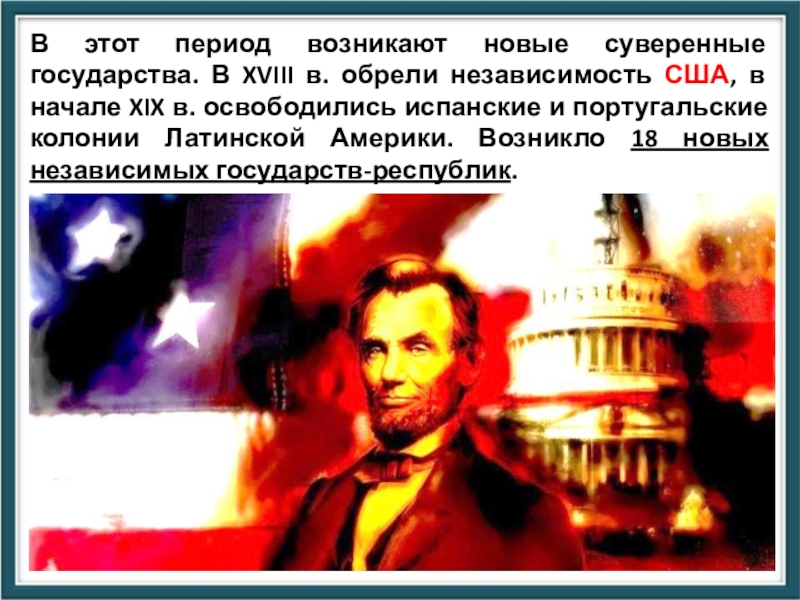 независимость США, в начале XIX в. освободились испанские и португальские колонии Латинской Америки. Возникло 18 новых независимых государств-республик.