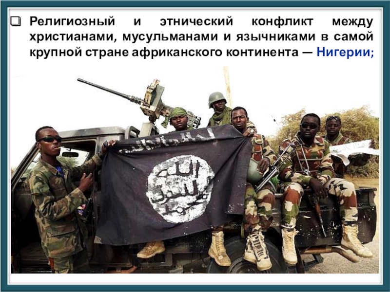 Слайд 39Религиозный и этнический конфликт между христианами, мусульманами и язычниками в самой