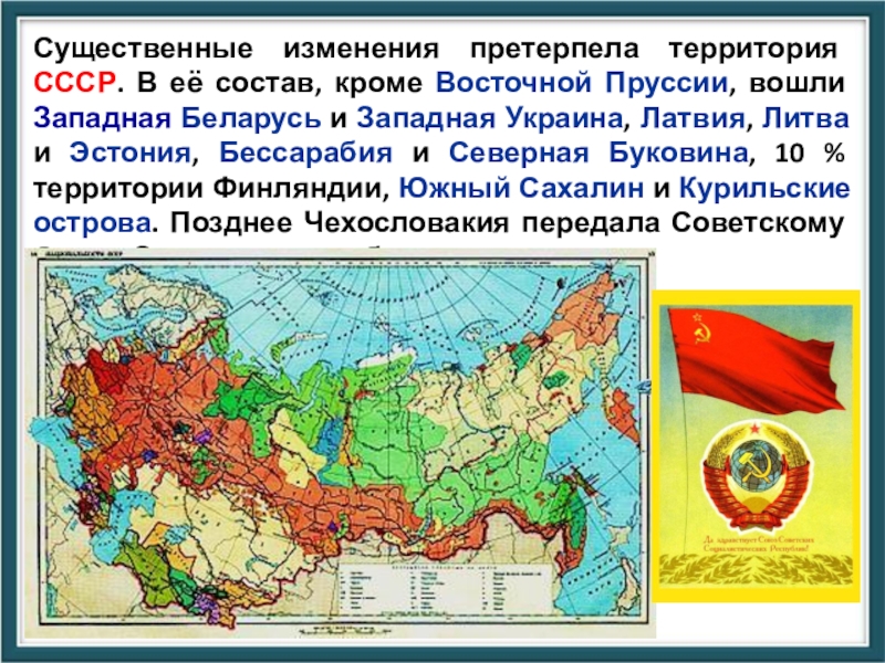 Слайд 19Существенные изменения претерпела территория СССР. В её состав, кроме Восточной Пруссии,