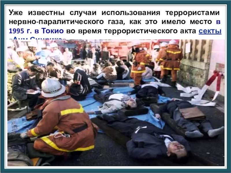 Слайд 48Уже известны случаи использования террористами нервно-паралитического газа, как это имело место
