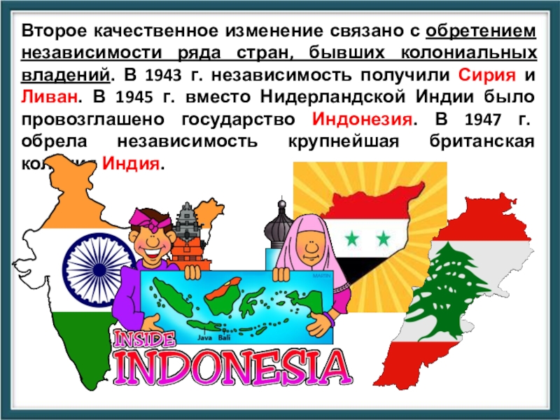 Слайд 21Второе качественное изменение связано с обретением независимости ряда стран, бывших колониальных