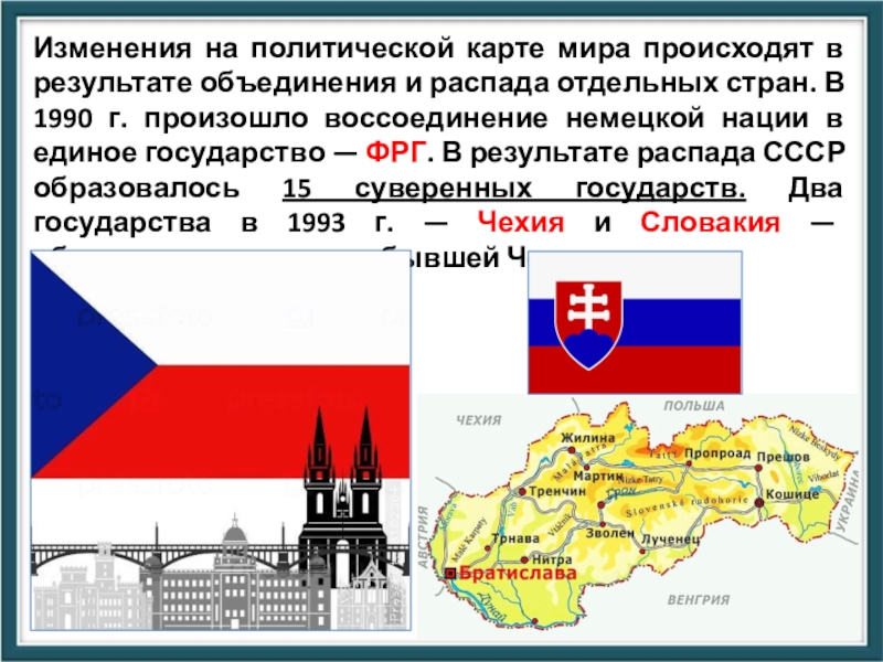 отдельных стран. В 1990 г. произошло воссоединение немецкой нации в единое государство — ФРГ. В результате распада СССР образовалось 15 суверенных государств. Два государства в 1993 г. — Чехия и Словакия — образовались на месте бывшей Чехословакии.