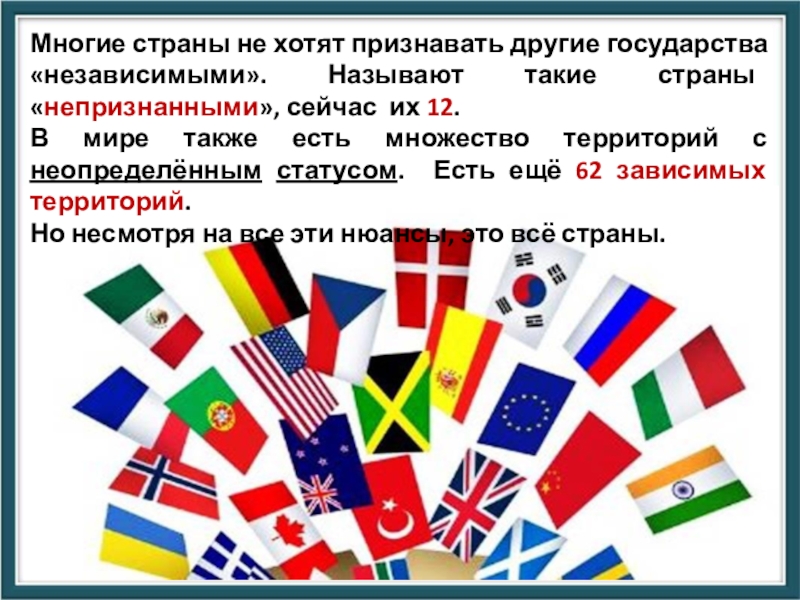 Слайд 31Многие страны не хотят признавать другие государства «независимыми». Называют такие страны
