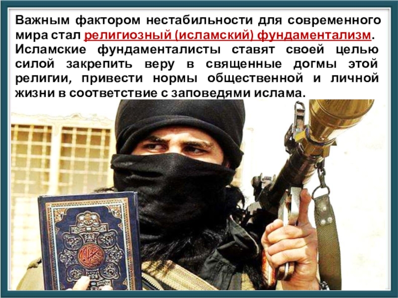 Слайд 46Важным фактором нестабильности для современного мира стал религиозный (исламский) фундаментализм.