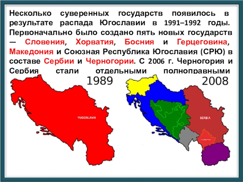Слайд 26Несколько суверенных государств появилось в результате распада Югославии в 1991–1992 годы.