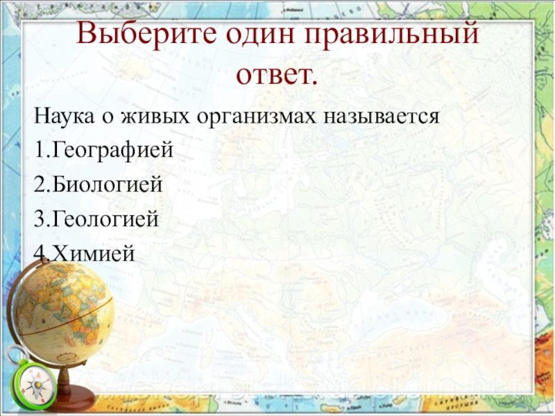 Выберите один правильный ответ.Наука о живых организмах называется1.Географией2.Биологией3.Геологией4.Химией