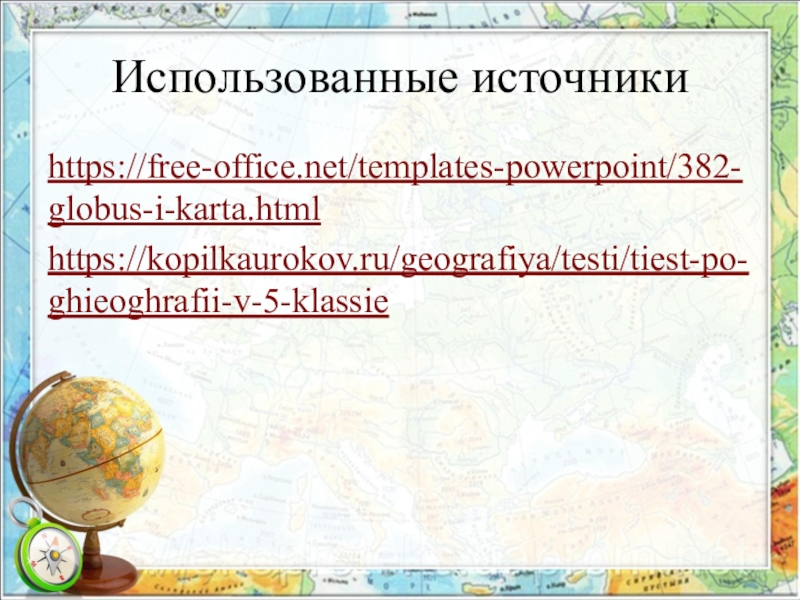 Использованные источники https://free-office.net/templates-powerpoint/382-globus-i-karta.htmlhttps://kopilkaurokov.ru/geografiya/testi/tiest-po-ghieoghrafii-v-5-klassie