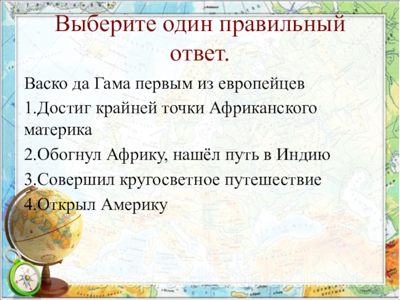 Выберите один правильный ответ.Васко да Гама первым из европейцев1.Достиг крайней точки Африканского материка2.Обогнул Африку, нашёл путь в