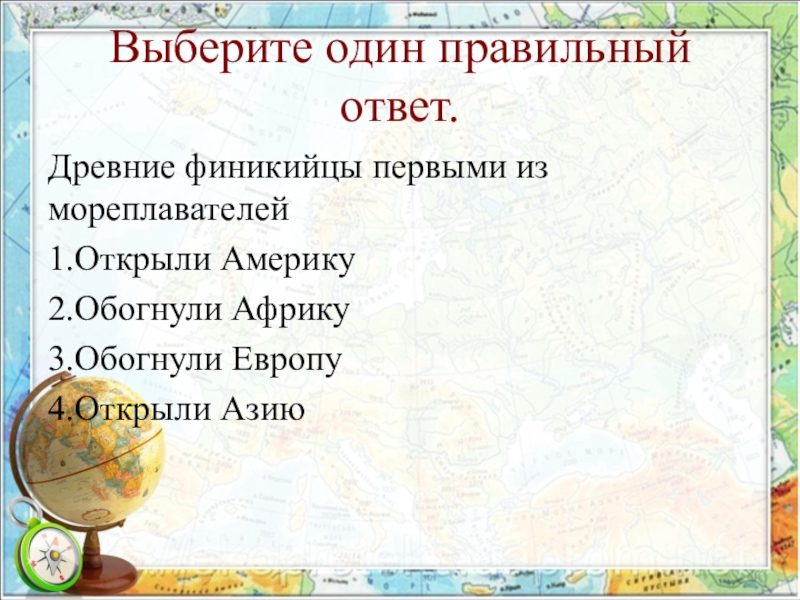 Выберите один правильный ответ.Древние финикийцы первыми из мореплавателей1.Открыли Америку2.Обогнули Африку3.Обогнули Европу4.Открыли Азию