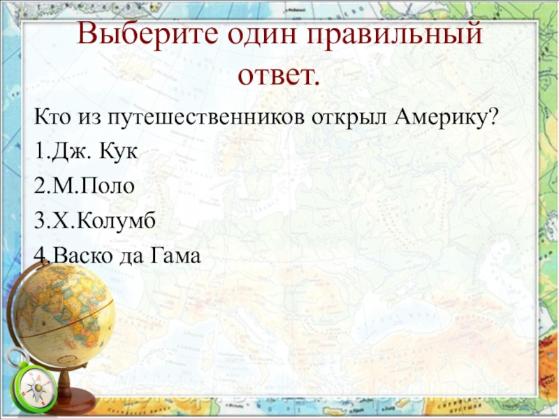 Выберите один правильный ответ.Кто из путешественников открыл Америку?1.Дж. Кук2.М.Поло3.Х.Колумб4.Васко да Гама