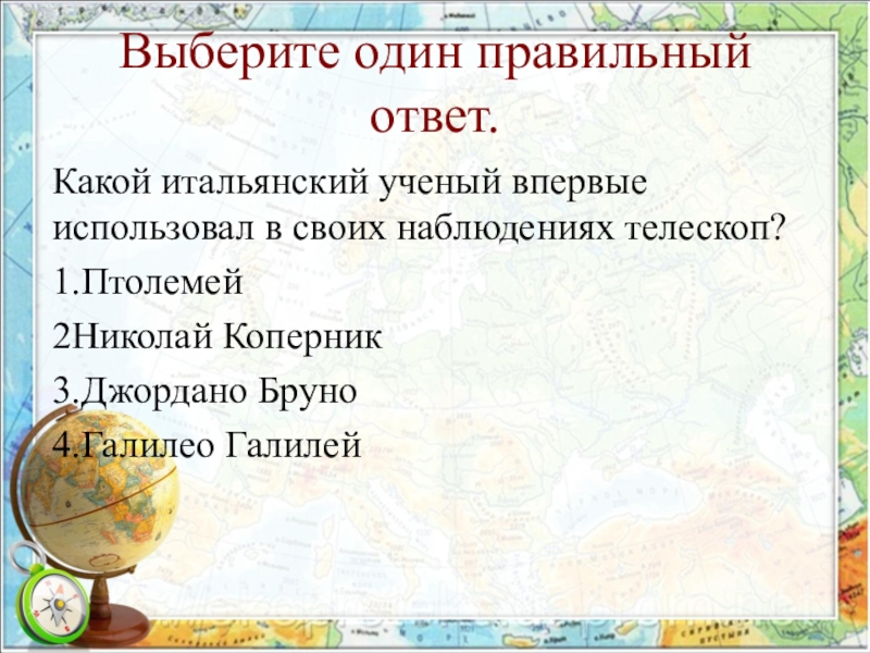 Выберите один правильный ответ.Какой итальянский ученый впервые использовал в своих наблюдениях телескоп?1.Птолемей2Николай Коперник3.Джордано Бруно4.Галилео Галилей