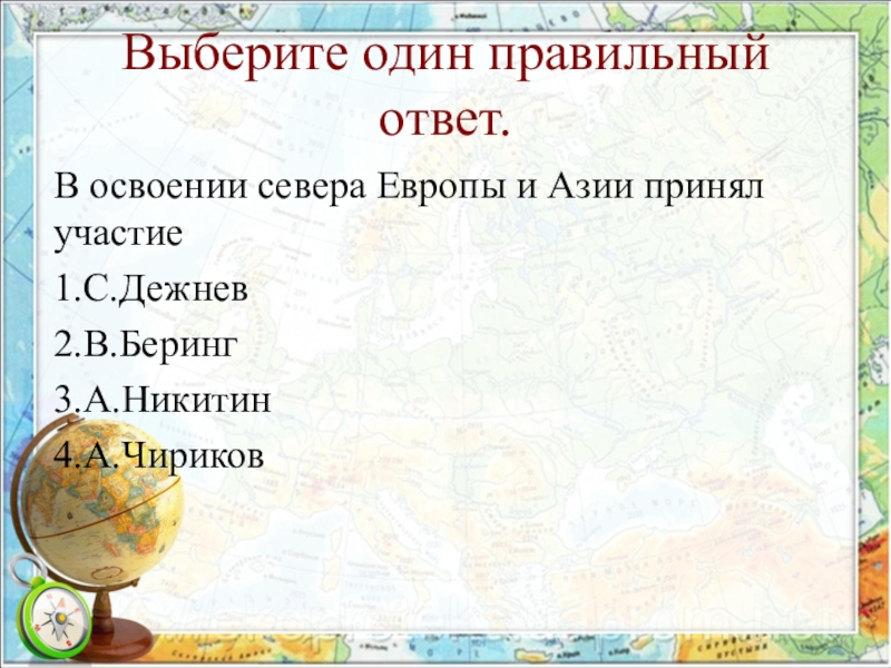 Выберите один правильный ответ.В освоении севера Европы и Азии принял участие1.С.Дежнев2.В.Беринг3.А.Никитин4.А.Чириков