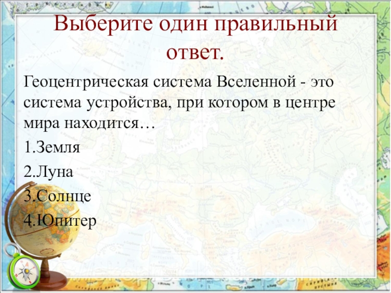 Выберите один правильный ответ.Геоцентрическая система Вселенной - это система устройства, при котором в центре мира находится…1.Земля2.Луна3.Солнце4.Юпитер
