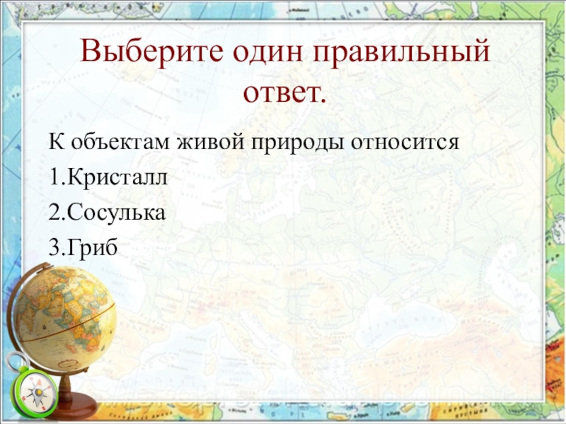 Выберите один правильный ответ.К объектам живой природы относится1.Кристалл2.Сосулька3.Гриб