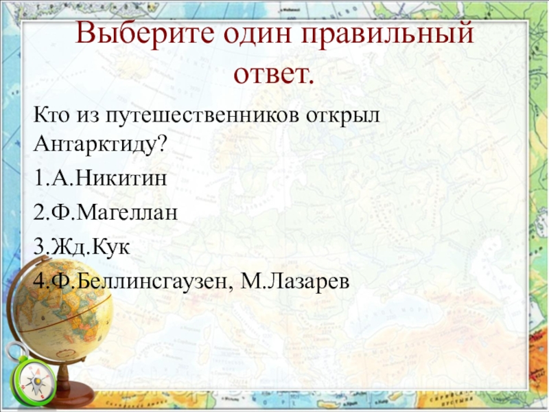 Выберите один правильный ответ.Кто из путешественников открыл Антарктиду?1.А.Никитин2.Ф.Магеллан3.Жд.Кук4.Ф.Беллинсгаузен, М.Лазарев