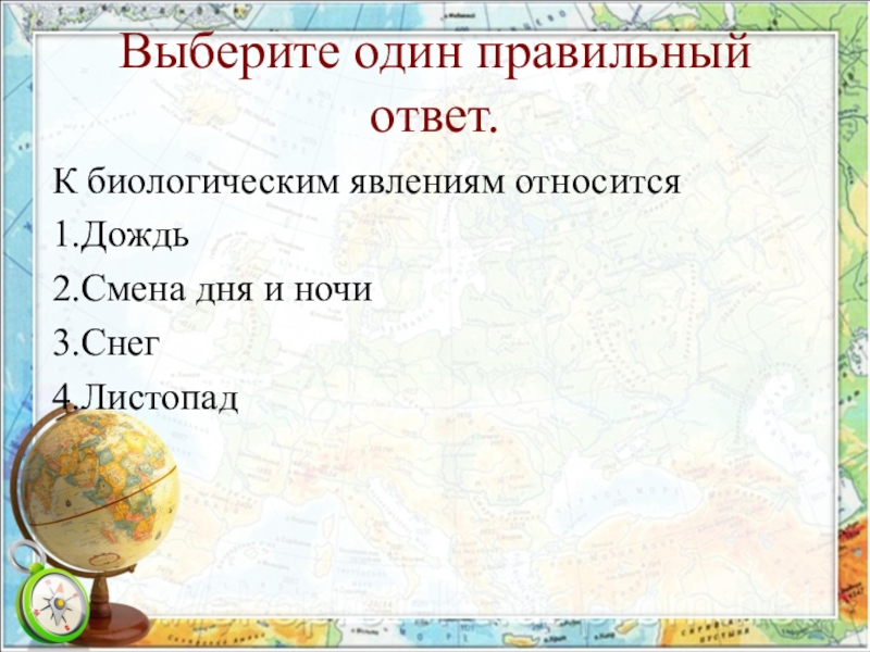 Выберите один правильный ответ.К биологическим явлениям относится1.Дождь2.Смена дня и ночи3.Снег4.Листопад