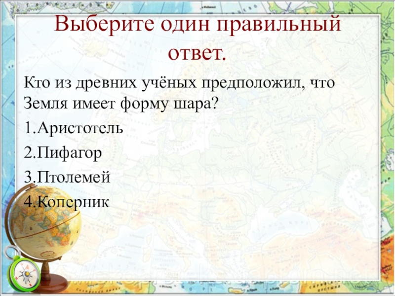 Выберите один правильный ответ.Кто из древних учёных предположил, что Земля имеет форму шара?1.Аристотель2.Пифагор3.Птолемей4.Коперник