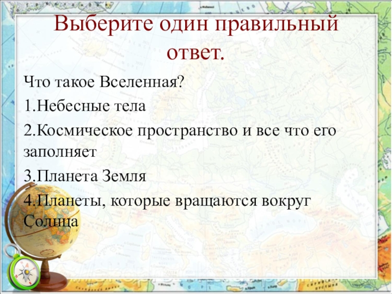 Выберите один правильный ответ.Что такое Вселенная?1.Небесные тела2.Космическое пространство и все что его заполняет3.Планета Земля4.Планеты, которые вращаются вокруг