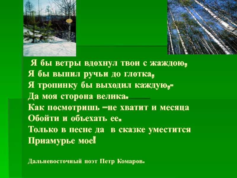 до глотка, Я тропинку бы выходил каждую,- Да моя сторона велика. Как посмотришь –не хватит и месяца Обойти и объехать ее. Только в песне да в сказке уместится Приамурье мое! Дальневосточный поэт Петр Комаров.