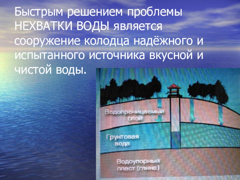 Слайд 5 Быстрым решением проблемы НЕХВАТКИ ВОДЫ является сооружение колодца надёжного и испытанного