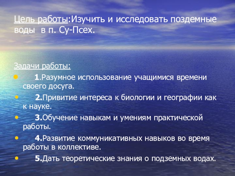 Цель работы:Изучить и исследовать поздемные воды в п. Су-Псех. Задачи работы: 1.Разумное использование учащимися времени своего досуга. 2.Привитие интереса к биологии и географии как к науке. 3.Обучение навыкам и умениям