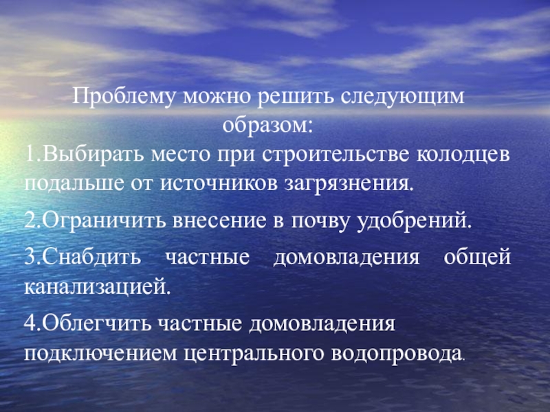 Проблему можно решить следующим образом:1.Выбирать место при строительстве колодцев подальше от источников загрязнения.2.Ограничить внесение в почву