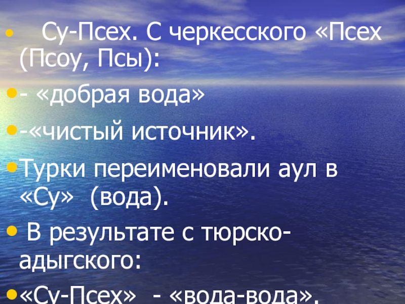 Слайд 4   Су-Псех. С черкесского «Псех (Псоу, Псы):